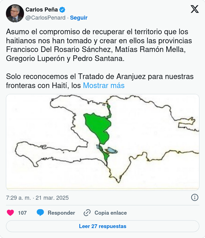 Santo Domingo, [Fecha] – El presidente del Partido Generación de Servidores (GenS), Carlos Peña, afirmó este viernes que, en una eventual gestión de gobierno liderada por su partido, reclamará "casi el 40%" del territorio que antiguamente pertenecía a la República Dominicana y que actualmente forma parte de Haití.